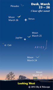 This week the Sun rises and sets almost exactly east and west. Observe its position as it crowns the day with glorious light and kisses the evening with turquoise twilight. The delicate, graceful crescent of the March new Moon hangs sweetly above the western horizon at dusk, dancing with stellar evening “stars” Venus and Jupiter. It’s a magnificent and beautiful sight to behold. Behold…