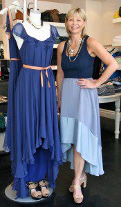 Elizabeth and James, a favorite at Two Skirts, sews up the look with a beautifully dramatic high-low dress in Parisian blue (pictured). Seen from behind, the dress grazes the ground with romantic ruffles like a floor-length gown. About face, and the billowing bottom drapes just past the knee for a fabulous frontal effect. This gorgeous dress is at once elegant and sexy.