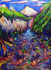 Campbell has painted live at shows for over two decades. His vast collection of over two thousand paintings includes work from concerts with BB King, Fats Domino, Willie Nelson, Widespread Panic, and String Cheese Incident. Currently, he’s painting the Denver Symphony, which involve painting 60 musicians in a single performance. He’s also serving as the artist in residence at Red Rocks. Only miles from his home, he admits, “the Amphitheater is my favorite outdoor studio, can you blame me?”