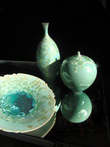 “Dalen creates shapely porcelain vessels and platters with rich glass glazes,” explained Christine Reich, owner, Lustre Gallery. “Each vessel is one-of-a-kind labor of love as the porcelain is worked and cured for over one year before it is thrown to its stately form. The minerals Dalen uses in his glazes blossom during the firing process to create crystalline forms that add drama and character to the rich colors the artist applies.”
