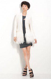 Season to season, Elizabeth and James keeps us anticipating the next big thing. This spring it was a neon pink sleeveless blouse and a crisp white blazer adorned with white ostrich feathers!