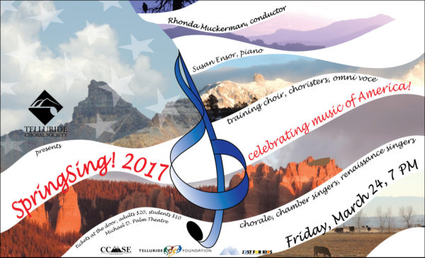 The Telluride Choral Society‘s SpringSing celebrates the music of America. The concert takes place Friday, March 24, 7 p.m. at the Michael D. Palm Theatre. Tickets, $20 for adults: $10 for children, at the door.