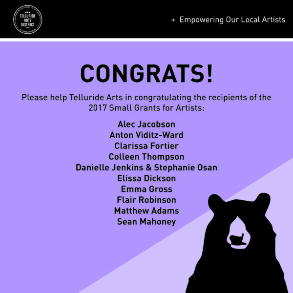 Telluride Arts announced the recipients of their annual Small Grants for Artists program. Eleven different artists were awarded a total of $10,000 for various projects and endeavors.