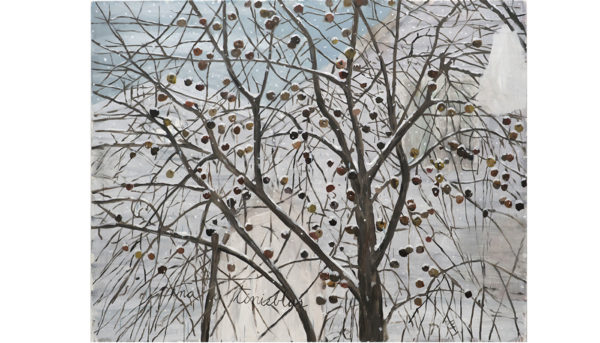 Many of the paintings offer scenes of disrupted journeys or the aftermath of significant episodes: stairs abandoned in fields, snow globes as souvenirs from elsewhere, tattoos that historicize the body, a glass house lost in a cluster of firs, apples frozen and rotting in the tree, and the underlying structure of columns left unfinished. These moments of abandonment and failure also contain the seed of possibility and renewal whose hopefulness echoes the artist’s informed but non-cynical approach to art in general and to painting in particular. In The Folktale (2017), marble stairs are isolated in a grassy clearing; they don’t appear to lead anywhere and a fire burns in the distance, but colorful wildflowers sprout, birds flutter, and sunlight ripples suggesting hope and rebirth.