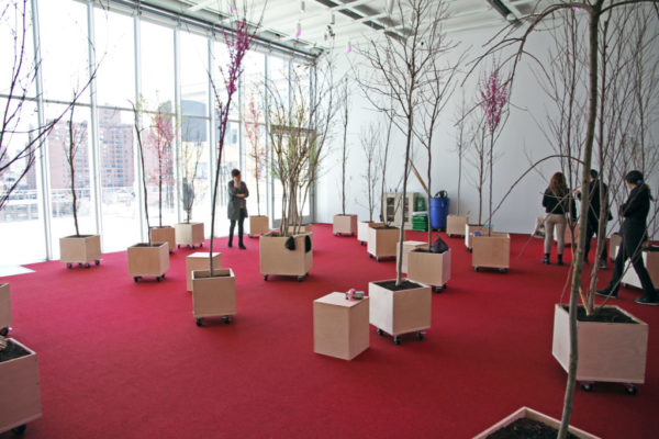 One of the best examples of environmental activism is Asad Raza’s “Root sequence. Mother tongue,” an installation of 26 trees – cherry, birch, persimmon, and others at different stages of growth, budding, leafing, blooming – set in a gallery near a sunrise-facing wall. Some of the planters feature “signatures” of their caretakers, a book here; a glove there. Is the artist saying the worker bees are the “real artists” in this story?