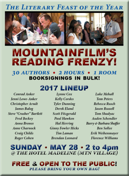 Mountainfilm uses the power of film, art, and ideas to inspire audiences to create a better world. Mountainfilm’s online schedule is now live, including times and venues for films, presentations, Moving Mountains Symposium, parties, Town Talks, book signings – don’t miss Sunday’s Reading Frenzy – special events, and more.