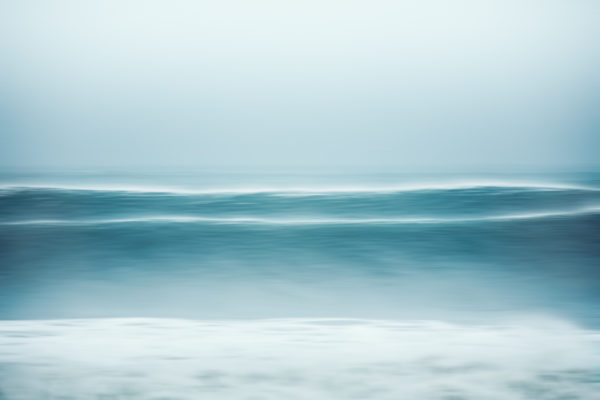 Buck’s minimalist images, her dreamy ocean and seascapes, reveal the outlines of two surfers on a mission, silhouettes in low relief against a contemplative sky at sunset. Another surfer, crouched and intent, rides a muscular stripe of blue and green, the back of a dragon rising from the water, its visceral power breaking the quiet beauty of a world that seems to hold it captive. A shallow depth-of-field image Buck took after an evening swim is an abstraction: sky and sea conspire to create a visual treatise on the color turquoise.