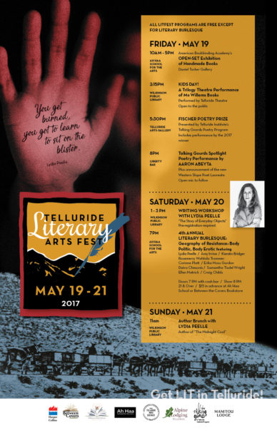 Get ‘Litʼ in Telluride at the 4th Telluride Literary Arts Festival. The weekend features eclectic events for lovers of books, reading, and poetry, Friday, May 19 – Sunday, May 21. Tickets, $15, to Saturday night’s Literary Burlesque are on sale as of Monday, May 8, at Telluride’s Ah Haa School or Between the Covers Bookstore. You snooze, you lose. Other than Burlesque, all Lit Fest events are free, but pre-registration is required for featured author Lydia Peelle’s Saturday workshop at the Telluride Library. (Scroll down for further details.)