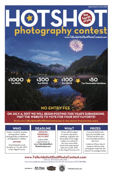 The submission form for the 8th annual Telluride Hot Shot Photography contest is live all day on Tuesday, July 4, 2017. Takes just a few minutes to fill it out and entry is free. Enter and win one of 13 cash prizes, plus customized stamps. Whether or not you submit, please check out the website and vote for your 2017 favorite. The deadline for submission is Wednesday, July 5, 2017 at noon.