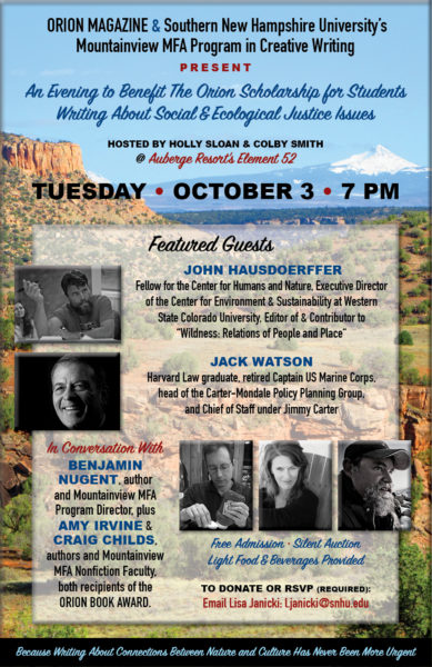 Because writing about connections between nature and culture has never been more urgent, join Orion Magazine and the Southern New Hampshire University Mountainview MFA Program in Creative Writing and teachers Craig Childs and Amy Irvine for an evening to benefit The Orion Scholarship for Students Writing about Social & Ecological Justice Issues. The event, hosted by Holly Sloan & Colby Smith, takes place at Auberge Resort’s Element 52, 398 S Davis St, in Telluride.