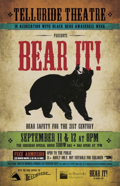 Telluride Theatre in association with the Town of Telluride’s Bear Awareness Week presents BEAR IT! Bear Safety for the 21st Century. Monday and Tuesday, September 11 and September 12 at Telluride’s Sheridan Opera House SHOW Bar. Bar opens at 7 p.m.; Show time is 8 p.m. Free and open to the general public (21+only please.) And a hat will be passed for a suggested donation of $15.