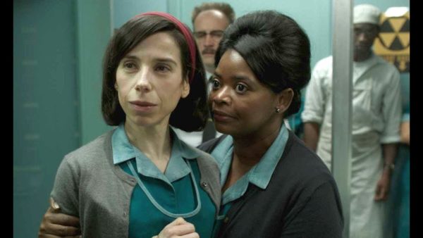 At first glance, Elisa appears to be trapped in a life of isolation, her world centered on hard-boiled eggs, masturbation and drudgery, her only friends the aforementioned out-of-work advertising illustrator, Giles – was he fired because he too was The Other, a not-so-repressed gay man? – and her co-worker and protector Zelda (Octavia Spencer as the Rock of Gibaltar), whom she also sees everyday at the government lab where they work mopping floors, cleaning toilets and sharing gossip.