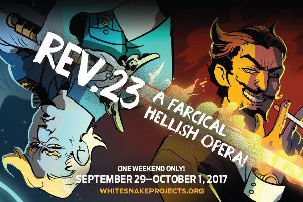 White Snake Projects REV 23 by creator-librettist Cerise Jacobs and composer Julian Wachner premieres at Boston’s John Hancock Hall on Friday September 29 – Sunday, October 1, 2017. The new opera is the centerpiece and opening show of the first Boston New Music Festival hosted by Juventas New Music. The opera marks a first outing for the newly reconfigured production company White Snake Projects, headed by Boston producer Georgia Lyman with Jacobs as Executive Producer.