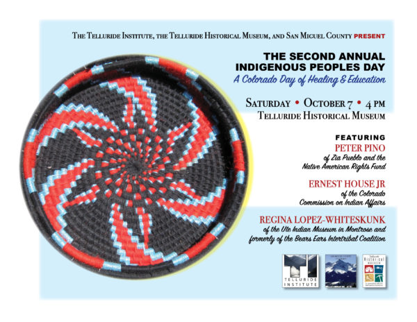 The Telluride Institute’s Ute Reconciliation program hosts the Second Annual Indigenous Peoples Day in Telluride, in partnership with San Miguel County and the Telluride Historical Museum. The Museum event is free, although donations to continue the Telluride Institute’s cultural outreach programs are encouraged.