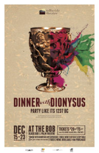 “Dinner with Dionysus” is now up through Saturday, December 23, at the “The Bob,” the Palm’s former Black Box Theatre, renamed in honor of “Glider Bob” Saunders, a longtime local and celebrity, who, since the early 1990s, flew high in the air – and thrilled equally on Telluride stages.