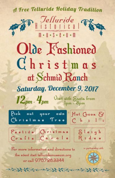 On Saturday, December 9, noon- 4 p.m., the Telluride Historical Museum and Schmid Family (on Wilson Mesa) co-host an “Olde Fashioned Christmas at Schmid Ranch.” Celebrate the season with this FREE Telluride tradition. Find your Christmas tree and enjoy festive crafts, hot cocoa, warm chili, Christmas carols, sleigh rides and visit with Santa from 1- 3 p.m. (There is a suggested donation of $40 for Christmas trees.) Scroll down for directions to the ranch.
