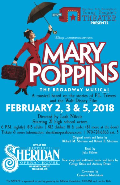 Telluride’s Sheridan Arts Foundation Young People’s Theater presents its annual high school musical production. “Mary Poppins” goes up Friday, February 2, Saturday, February 3 & Monday, February 5, 2018 at the historic Sheridan Opera House.