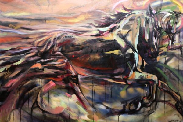 Through her art, Lara Branca explores the limitless potential of the abstracted equine figures which occupy the vast landscapes of her imagination. Multiple horizons, shifting perspectives, and translucent forms shape the dream-like feeling of her large canvases.