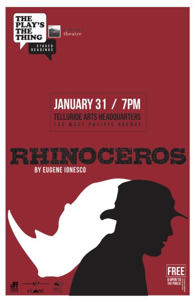 A reading series brought to you by Telluride Theatre, THE PLAY’S THE THING, returns for the 2018 season. Bringing great dramatic literature to life with staged readings, THE PLAY’S THE THING is a fresh, fun way to experience theatre. A reading of “Rhinoceros” by Eugene Ionesco takes place Wednesday, January 31, 7 p.m. at Telluride Arts HQ, 135 West Pacific Avenue. THE PLAY’S THE THING is FREE and open to the public, however, donations are encouraged. ($10 suggested, a hat will be passed.) For more information or to be an active participant in THE PLAY’S THE THING, please call 708- 3934.