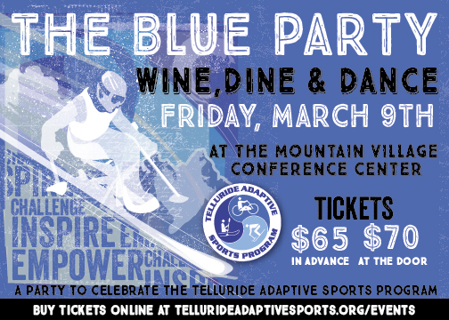 TASP’s Blue Party, one of the organization’s main annual fun-raisers, is booked into the Telluride Conference Center in Mountain Village on Friday, March 9, 6 p.m. Tickets are $65 in advance at Telluride Adaptive Sports; $70 at the door.
