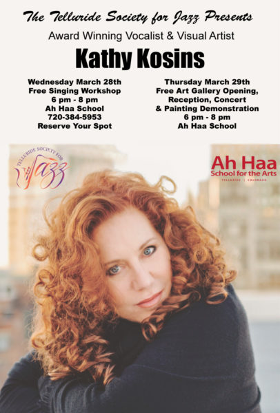 The Telluride Society for Jazz brings award-winning vocalist Kathy Kosins to Telluride on Wednesday, March 28 and Thursday, March 29, for a series of music clinics and to celebrate the opening of a show of her paintings at Telluride’s Ah Haa School. Kosins is also giving a free concert at Ah Haa on the 29th, 6 – 8 p.m., accompanied by Denver keyboardist Jeff Jenkins. The evening includes wine, beer and heavy appetizers.