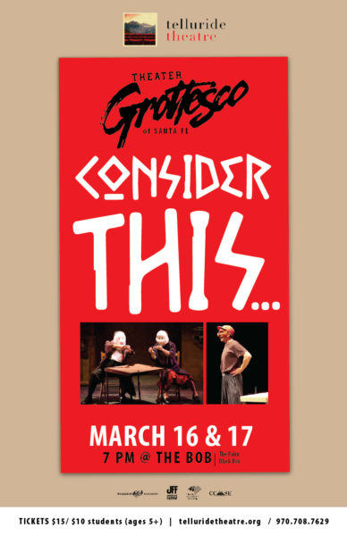 Telluride Theatre presents Santa Fe’s Theater Grottesco’s “Consider This…” The event takes place Friday & Saturday, March 16 & March 17, 7 p.m. at The Bob Saunder’s Memorial Theatre (or The Palm’s Black Box). Tickets are $15 for adults (GA); $10 for students (ages 5+). Tickets here or call 970-708-7629.
