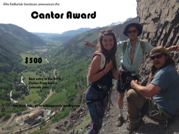 Thanks to a generous donation from Elaine Cantor’s family, this year the Telluride Institute’s Talking Gourds Program will add a $500 Cantor Award to its national Fischer Prize contest for the best poem by a Colorado poet. The Cantor Award will be presented at the Telluride Literary Arts Festival, May 18-20. For contest rules, go here.