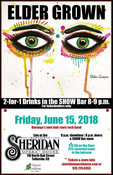 Elder Grown from Durango kicks off the summer fun at the Sheridan Opera House. Show is this Friday, June 15, 9 p.m., with doors and SHOW Bar opening at 8 p.m. Tickets are $15 GA on the floor; $25 reserved seats in the balcony. (The ticket fee is included in that price for this show only to kick off our summer.) Tickets and information: sheridanoperahouse.com or 970.728.6363 x5.