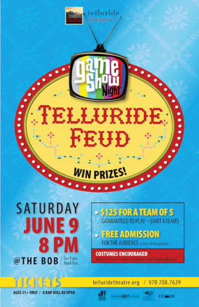 Telluride Theatre‘s “Game Show Night: The Telluride Feud” takes place on Saturday, June 9, 8 p.m., at “The Bob,” aka The Palm’s Black Box Theatre. $125, team of 5 guaranteed play. (Limit 8 teams.) GA admission is FREE for LIVE audience. (However, a hat will be passed.) Tickets here or call 970-708-7629. The event is hosted by Megan Honea and Geneva Shaunette. Ages 21+ only please.