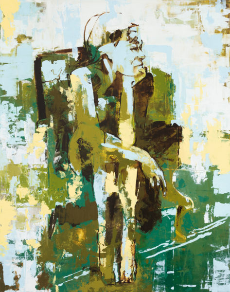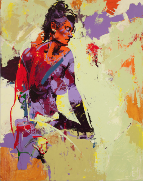 Known for his monumental figurative paintings, Jason Lee Gimbel renders full-figure works using abstraction-expressionist brushwork and vibrant colors.