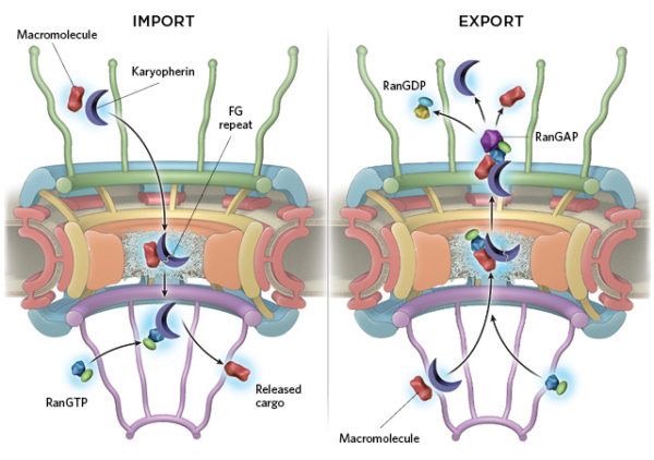 “The interior, or ‘symmetric’ core is composed of an inner ring and two outer rings that sit on either side of the nuclear envelope. The NPC symmetric core helps to stabilize the extreme curvature of the nuclear membranes abutting the core, forms the diffusion barrier, and provides a central transport channel. On the outside, the NPC symmetric core is decorated with proteins called cytoplasmic filaments that participate in protein transport and mRNA export.”