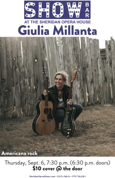As part of the Sheridan Opera House & Barbed Wire Production’s singer-songwriter series, Giulia Milanta to play the SHOW Bar at Telluride’s Sheridan Opera House, produced by Show time is Thursday, September 6, 7:30 p.m.; doors, 6:30 p.m. There is a $10 cover.