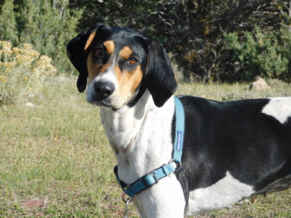 I am a four- to five-year-young female Hound mix, who recently arrived here at Second Chance with my buddy Oreo. We were found running on the highway. (We figured it was the best place to be rescued.) I had been attacked by a decent sized animal and had a large bite mark on my neck. It was super scary and I was rather freaked out when I first arrived.