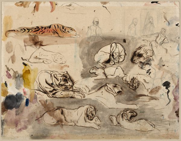 Delacroix also rendered possibly the most convincing newborn in Western painting (in “The Natchez,” with its idealized Native American parents). He seems to have been an incessant draftsman, doodling in the margins of print proofs, always with much on his mind. In one of the show’s most stupendous drawings, “Studies of Tigers and Men in 16th-Century Costumes,” Delacroix repeatedly draws, in brown ink and watercolor, both the animal at rest and its regal head. But in the upper corner, several Dutch burghers are lightly sketched in graphite, as if thoughts of Rembrandt and Hals had suddenly intruded.