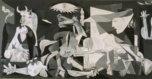The inherent violence and the way Picasso blocked those images to unfold the tragic drama in the composition also points to ”Guernica.”
