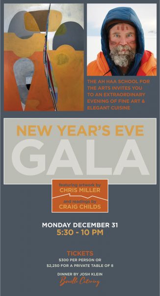 Welcome to the Ah Haa’s School’s New Year’s Eve gala, Monday, December 31, 5:30 – 10 p.m., an elegant sit-down dinner prepared by Josh Klein, complemented by a sumptuous, parallel banquet of food for thought: the aforementioned Miller and Childs happening.
