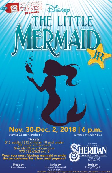 Telluride’s SAF Young People’s Theater kicks off its 20th anniversary school year with its annual middle school (grades 6 – 8) production of “The Little Mermaid.” The show is live at the historic Sheridan Opera House from Friday November 30 through Sunday, December 2, 2018. Doors open at 5:30 p.m. Adults $15; children 18 & under $12 & lap children free. ($1 more at the door.) For tickets and more information visit here or call 970-728-6363 ext. 5.