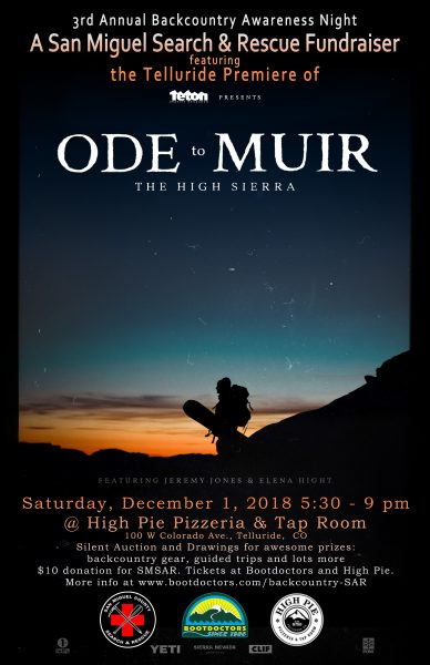 The 3rd Annual Backcountry Awareness for Telluride’s San Miguel County Search and Rescue is the biggest single fundraiser for the hard-working, life-saving nonprofit. The goal of the event is to start the winter season with greater awareness of backcountry touring opportunities, challenges and safety protocols and to support SAR. It is all happening on Saturday, December 1, 5 – 9 p.m. at High Pie Pizzeria, 100 Colorado Ave. The centerpiece of the evening is Teton Gravity Research‘s latest film, “Ode to Muir. Please scroll down to watch the trailer.