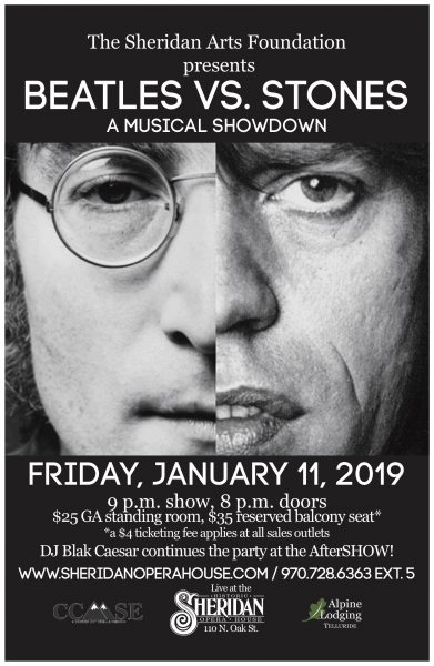Telluride’s Sheridan Arts Foundation presents Beatles vs. Stones live at the Sheridan Opera House on Friday, January 11, 2019. Show begins at 9 p.m.; doors, 8 p.m. Tickets are $25 GA; $35 reserved seats in the balcony.(A $4 ticketing fee is charged at all ticket outlets.) Tickets can be purchased at www.sheridanoperahouse.com or 970.728.6363 ext. 5.