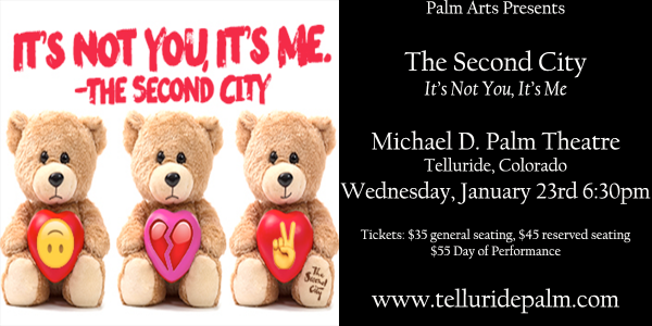 Telluride’s Palm Arts announces another great winter performance, this one featuring the legendary American improv comedy troupe The Second City at the Michael D. Palm Theatre. The show takes place Wednesday, January 23, 2019, starting at 6:30 p.m. Advance tickets are $35 GA seating; $45 reserved seating; $55 day of performance. All tickets are available at www.telluridepalm.com