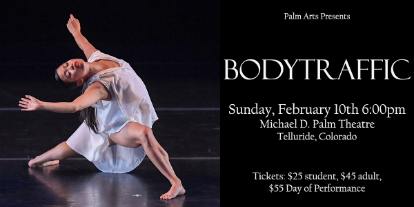 Telluride’s Palm Arts presents BODYTRAFFIC, a contemporary LA dance group that is shaking up the modern dance scene in the US. Advance tickets are $35 GA seating; $45 reserved seating; $55 day of performance All tickets are available at www.telluridepalm.com