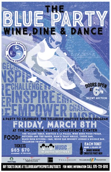 On Friday, March 8, 2019, the Telluride Adaptive Sports Program hosts its 23rd annual spring fundraiser: The Blue Party. The event takes place at the Telluride Conference Center in Mountain Village, 6-10 p.m. The ticket price of $65 ($70 at the door) includes a glass of award-winning Emeritus Pinot Noir and a selection of hearty hors d’oeuvres from some of Telluride’s top restaurants. Shake your tail-feathers to the sounds of the ever-popular Anders Brothers. A silent auction features many one-of-a-kind items and get-away vacations.