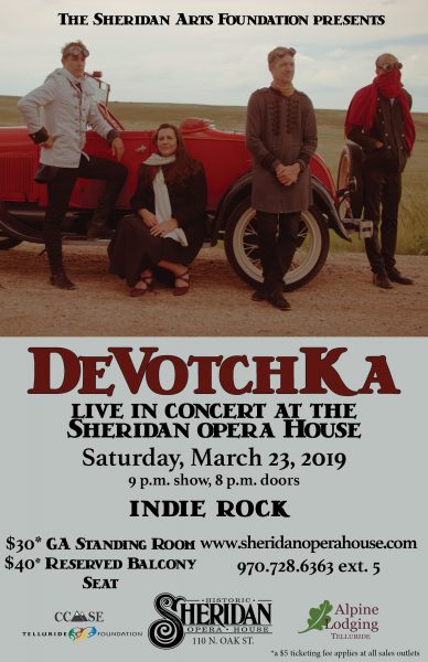 Telluride’s Sheridan Arts Foundation presents DeVotchKa live at the Sheridan Opera House on Saturday, March 23. Doors, 8 p.m.; show time is 9 p.m.Tickets are $30 general admission on the floor; $40 reserved seats in the balcony. (A $5 ticketing fee is charged at all ticket outlets.) Tickets and additional event information are available at sheridanoperahouse.com or 970.728.6363 x5.