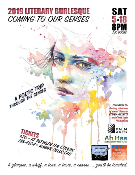 Also debuting at Literary Burlesque are members of the Telluride Dance Collective. In preparing a piece for the sense of touch, Burl Gurl poet Elissa Dickson is excited to share the storytelling stage with this group, which is determined to “create a joyful, supportive community of dancers in Telluride by practicing and performing authentic, expressive movement.” A glimpse, a whiff, a tone, a taste, a caress … you’ll be touched.