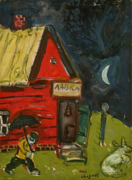 In “L’homme au parapluie,” Chagall depicts his parents’ home, with a sign above the door reading “Shop.” The little painting was created in the 1930s, 10 years after the artist left home. Vitebsk, as he knew it, was almost completely destroyed during the war.