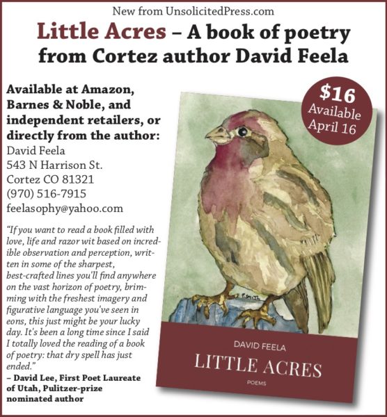 David Feela is a poet, free-lance writer, writing instructor, and book collector. His work has appeared in regional and national publications, including the High Country News‘ “Writers on the Range,” Mountain Gazette, Small Farmer’s Journal, Utne Reader, and in the newspaper as a “Colorado Voice” for The Denver Post.