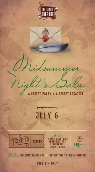 The “Midsummer Night’s Gala” is a fundraiser for Telluride Theatre. It takes place, as last year, at a secret location, on Saturday, July 6, 6 – 10 p.m. A limited number of tickets at $200 are available here or call 970-708-7629. The evening includes cocktails, dinner, immersive art + performance, live music. Ages 21+ only. Instructions and more details follow your ticket purchase.