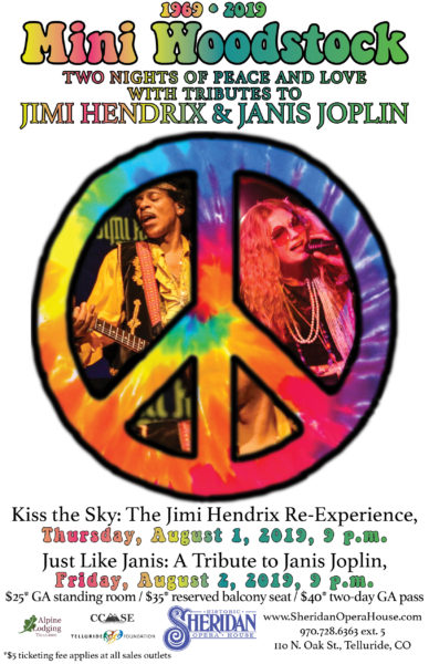 Telluride’s Sheridan Arts Foundation presents “Mini Woodstock: Two Nights of Peace & Music,” tributes to Jimi Hendrix and Janis Joplin live at the Sheridan Opera House on Thursday, August 1 and Friday, August 2, 2019 at 9 p.m.