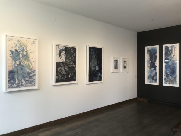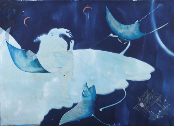The depths of ocean and cosmos are evoked through the artist’s creative use of cyanotype, a 19th-century photographic printing technique that produces deep indigo shades over which she layers drawings in ink and pencil.