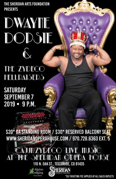 Telluride’s Sheridan Arts Foundation presents Dwayne Dopsie & The Zydeco Hellraisers live at the Sheridan Opera House on Saturday, September 7, 2019. Doors, 8 p.m.; show time is 9 p.m. Tickets, $20 GA Floor, $30 reserved seats in balcony. (A $5 ticketing fee is charged at all ticket outlets.) Tickets and additional event information are available at sheridanoperahouse.com or 970.728.6363 x5.